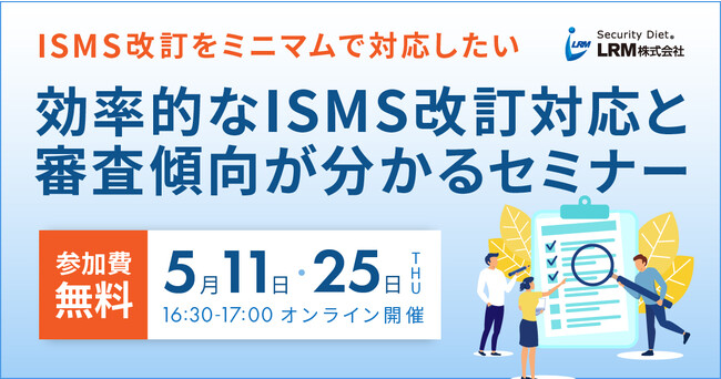 LRM株式会社(以下 LRM、本社:兵庫県神戸市、代表取締役CEO:幸松哲也)が、2023年5月11日(木)・5月25日(木)の2日程において、「効率的なISMS改訂対応と審査傾向が分かるセミナー」を開催いたします。