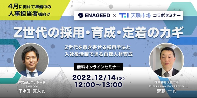オンライン採用のコンテンツとコミュニケーションを支援する天職市場(本社:東京都新宿区西新宿、代表取締役:春名 敬太)は、2022年12月14日(水)に人材採用担当者向けのWEBセミナー『Z世代の採用・育成・定着のカギ -Z世代を惹き寄せる採用手法と入社後活躍できる自律人材育成-』を開催いたします。