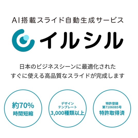 ■ イルシルについてAI搭載スライド自動生成サービス「イルシル」は、生成AIでスライド資料作成を自動化し、誰でも簡単にスライドやパワポが作れるサービスです。入力したテキストからスライドを自動生成できるだけでなく、3,000種類以上のデザインテンプレートからオリジナルで作成することも可能です。