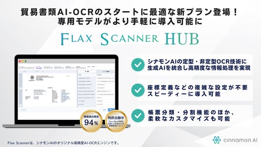 国内の大手企業へAI(人工知能)ソリューションを提供する株式会社シナモン(本社:東京都港区、代表取締役Co-CEO:平野未来/堀田創 以下、シナモンAI)は、AI-OCR×生成AIで企業のデータ活用を拡張する、定型・非定型帳票対応のAI-OCRプラットフォーム「Flax Scanner HUB(フラックス・スキャナー・ハブ)」に、貿易書類の専用AI-OCRモデルを手軽に利用できる新しいプラン「貿易書類 Starterプラン」を、本日8月9日より販売開始します。また、この度の新プラン登場にともない、先着10社限定で、「貿易書類 Starterプラン」の初期費用(20万円[税抜])が無料となる特別キャンペーンも実施します。