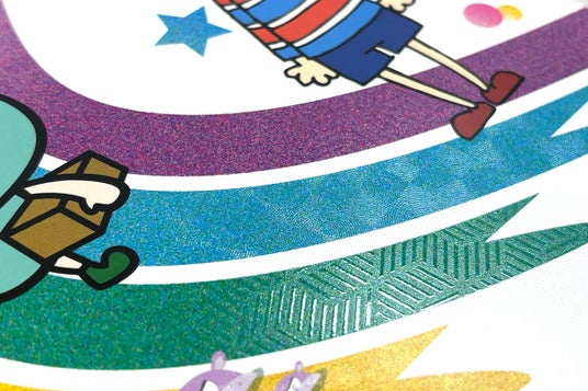 光沢のある浮き出したような文字や模様が表現できる加工。「エンボス加工」は紙を挟み込んでプレスすることにより凹凸を生み出しますが、「疑似エンボス加工」は表面に2種類のニス(ハジキニスと光沢ニス)を塗ることで、紙から模様が浮き出したような質感を再現します。