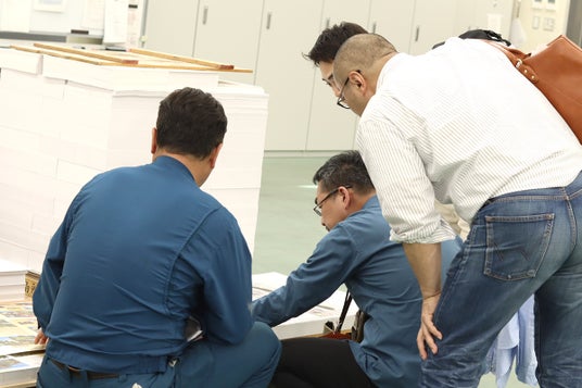 ▲営業社員、デザイナーが印刷工場を実際に見学し、印刷職人とチームを組んでサンプル集を作りました。