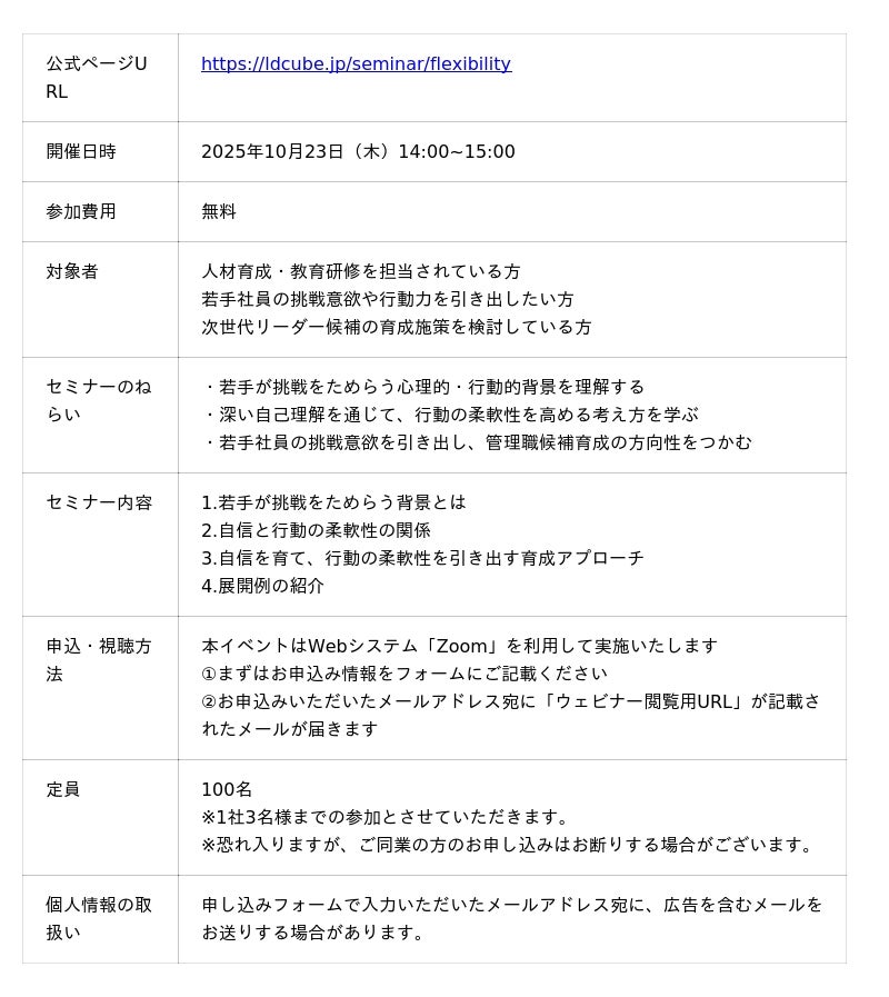 研修のスタイルにとらわれない企業向け人材育成サービスを提供する株式会社LDcube(本社:東京都千代田区、代表取締役社長:新井澄人、以下「当社」)は、「若手社員の挑戦を後押しする育成法とは~自信を育む"行動の柔軟性"アプローチ~」と題してウェビナーを開催しますので、お知らせします。