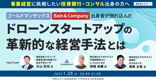 ヤマトヒューマンキャピタル株式会社(本社:東京都千代田区、代表取締役:堀江 大介)は、2025年1月28日(火) 20:00よりオンラインにて、株式会社リヴァンプと株式会社エアロネクストウェビナーとのキャリアウェビナー『ドローンスタートアップの革新的な経営手法とは』を開催いたします。