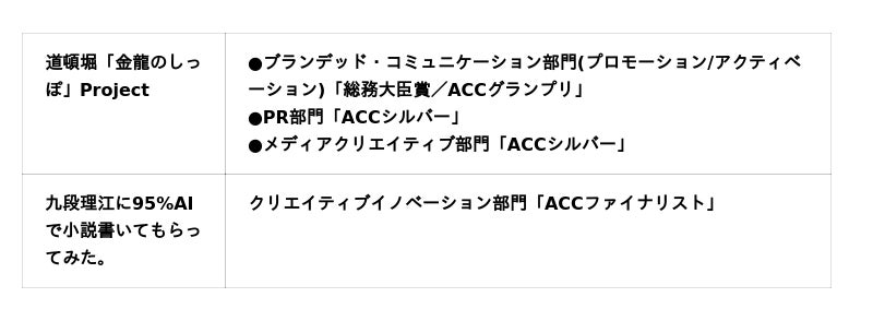 結果:マーケティング・エフェクティブネス部門 「総務大臣賞/ACCグランプリ」PR部門 「ACCファイナリスト」ブランデッド・コミュニケーション部門(プロモーション/アクティベーション) 「ACCファイナリスト」