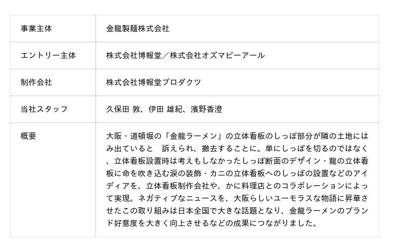 株式会社オズマピーアール(本社:東京都千代田区、代表取締役社長:中尾 敏弘)は、優れたクリエイティブを表彰する日本最大級のアワード『2025 65th ACC TOKYO CREATIVITY AWARDS』において、「道頓堀「金龍のしっぽ」Project」が最高賞「総務大臣賞/ACCグランプリ」を含む、計3部門・3つの賞を受賞しました。