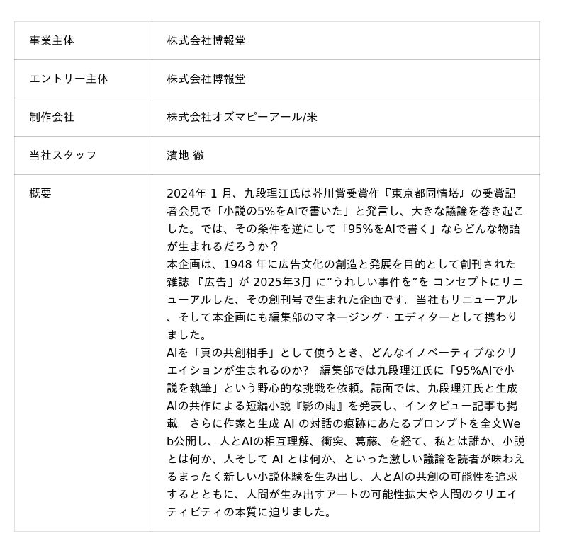 その他、「九段理江に95%AIで小説書いてもらってみた。」がクリエイティブイノベーション部門のファイナリストにも選出されました。