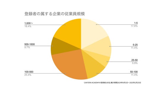 「CANTERA ACADEMY」に登録いただいた方が所属する企業の従業員規模も多様であり、特に、