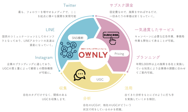 OWNLY(オウンリー)は、SNSのマーケティングを一元管理できるサブスクリプション型のマーケティングプラットフォームです。TwitterやInstagramなどのSNSキャンペーンで集客し、ユーザーの声(UGC)を活用したマーケティング&コミュニケーションに貢献。様々なSNSマーケティング手法を、これひとつで実現できます。