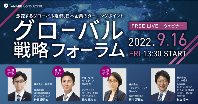 日本の経営コンサルティングのパイオニアである株式会社タナベ経営(本社:東京都千代田区・大阪市淀川区、代表取締役社長:若松 孝彦)は、2022年9月16日(金)13:30~16:25に無料ウェビナー「グローバル戦略フォーラム~激変するグローバル経済、日本企業のターニングポイント~」を開催いたします。https://tanabekeiei.hmup.jp/globalstrategy_forum_220916