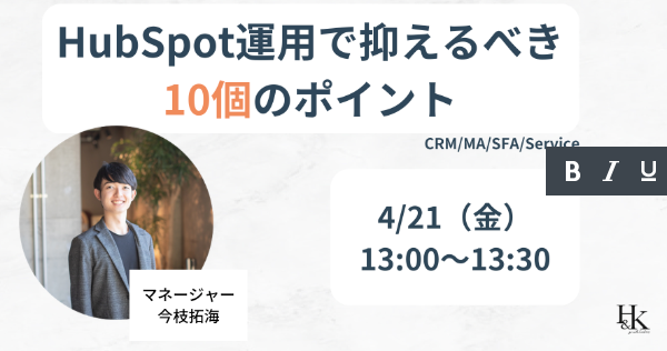 ■企業のマーケティング、DX化などの支援を行う株式会社H&K(本社:神奈川県横浜市、支店:東京都新宿区、代表取締役CEO:安藤弘樹)が、2023年4月21日(金)に、【HubSpot Starter利用者様向け】「HubSpot運用で抑えるべき10個のポイント」に関するウェビナーを開催することとなりましたので、ご案内いたします。