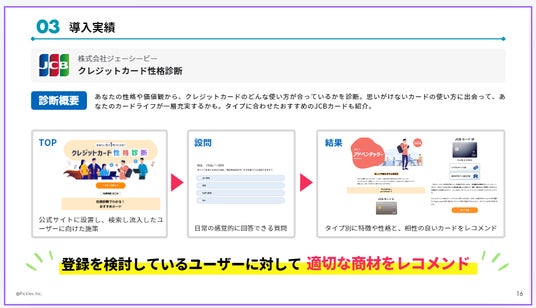 ユーザーの性格や価値観から、クレジットカードのどんな使い方が合っているかを診断。クレジットカードを検討中のユーザーに対し、診断結果に基づいたパーソナライズされたカード提案を行うことで、会員登録を促進。