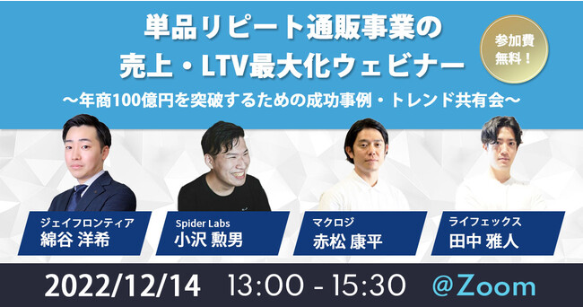 株式会社Spider Labs(東京都港区、代表取締役社長:大月 聡子、スパイダーラボズ 以下Spider Labs)は、2022年12月14日(水)13:00から「単品リピート通販事業の売上・LTV最大化ウェビナー」と題し、ジェイフロンティア株式会社、株式会社マクロジ、株式会社ライフェックスと共催ウェビナーを開催いたします。