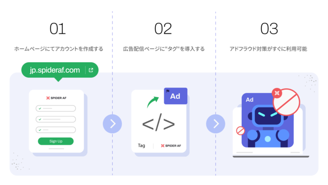 導入方法はとても簡単。ホームページ上より登録を行い、タグを発行することで最短5分でアドフラウド対策が可能となります。(