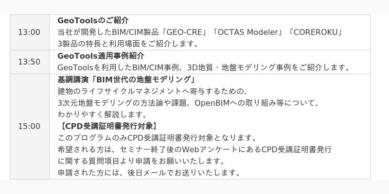 さらに、基調講演「BIM世代の地盤モデリング」では、建設ライフサイクルマネジメントへ寄与するための、3次元地盤モデリングの方法論や課題、OpenBIMへの取り組み等の業界最新動向をわかりやすく解説します。