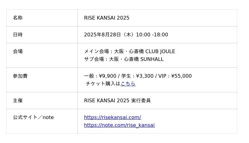 https://risekansai.com/session-B5.php※ご参加にはRISE KANSAIのイベントチケットが必要です。チケットは上記ページよりご購入いただけます。