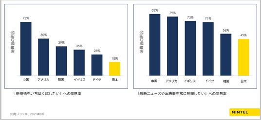「ミンテルが36市場で実施した調査では、『新しい技術をいち早く試したい』と回答した割合は、中国が72%だったのに対し、日本は18%にとどまりました。一方、『最新のニュースや出来事を常に把握していたい』という回答は日本でも49%に達しており、情報収集意欲は高いことが分かっています。」