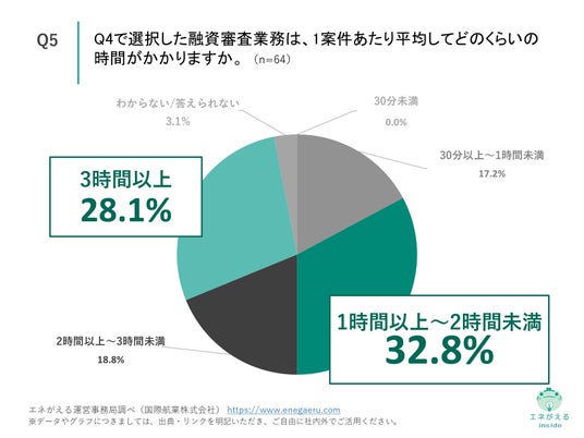 「Q5.Q4で選択した融資審査業務は、1案件あたり平均してどのくらいの時間がかかりますか。」(n=64)と質問したところ、