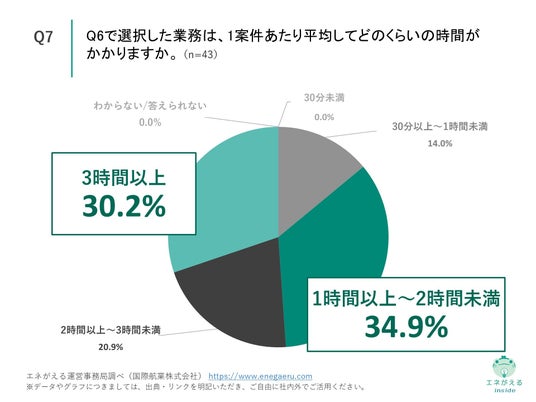 「Q7.Q6で選択した業務は、1案件あたり平均してどのくらいの時間がかかりますか。」(n=43)と質問したところ、