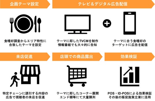その企画を、テレビCMのほかインフォマーシャルや店頭でのサイネージコンテンツなどに活用し、エリアでの認知促進を図るほか、食嗜好別にターゲットへの広告配信、食品スーパー店頭でのコーナーの設置や商品露出のフォローを行います。