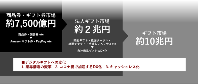 日本国内のギフト市場は約 10 兆円と言われており、当社はその中でも、商品券・ギフト券などの金券市場がターゲット市場にあたると捉え、金券市場からギフト市場全体を掌握していくこととしてサービスの開発・改善を推進しております。