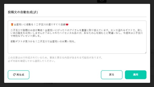 ・AIによって作成された文章は不正確であったり不適切な内容が含まれる可能性がございます。投稿へ使用する際は必ず内容をご確認ください。