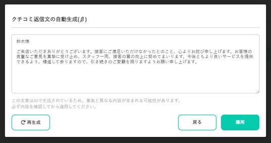 AIアシスト機能によりクチコミ返信に対する工数が従来の50%程度削減できました。
