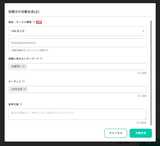 商品・サービス情報、投稿に含めたいキーワード、ターゲットを入力し文章生成します。