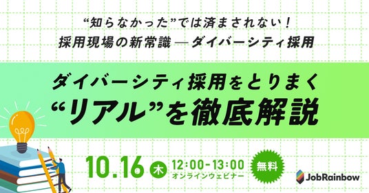 株式会社JobRainbow(本社:東京都千代田区、代表取締役:星賢人)は、2025年10月16日(木)12:00-13:00にてオンラインセミナー「 “知らなかった”では済まされない採用現場の新常識ーダイバーシティ採用 ~ダイバーシティ採用を取り巻く“リアル”を徹底解説~」を開催いたします。