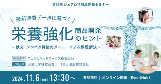 商品開発の方向性を決める上で、生活者の購買データは重要な道しるべになります。今回は、フェリカネットワークス様を基調講演に迎え、「IDレシートデータ」を活用した栄養強化商品の開発について具体的なアプローチを掘り下げます。消費者ニーズに応える商品開発のヒントとは。登壇企業の方々へ直接質問できるコーナーもございます。ぜひ、ご参加ください。