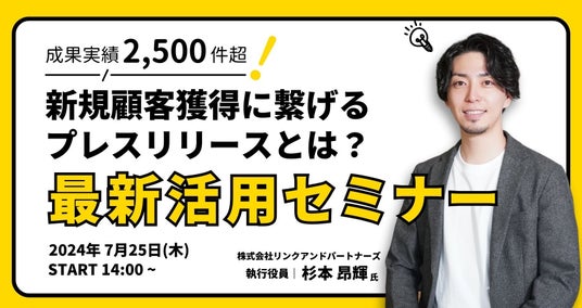 企業のPR支援プロダクト「PRIZMA」ブランドを展開する株式会社リンクアンドパートナーズは、2024年7月25日(木)14:00-15:00に『【2500件超の案件実績あり】新規顧客の獲得ができる「プレスリリース」とは?注目を集める手法を公開!』と題するオンラインセミナーを開催いたします。