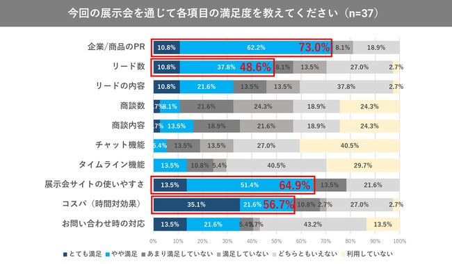 50%を超える企業がDMMオンライン展示会に出展したことに満足していることがアンケート結果から明らかになりました。特に、予め期待していた「企業/商品のPR」は70%を超え、「リード数」においても約50%の満足度を感じていることがアンケートから出ており、一定数の効果があったことがわかりました。他にも、「展示会サイトの使いやすさ」や「コスパ(時間帯効果)」も高い満足度を得ることができ、オンラインならではの強みが伝わった結果になったかと思います。
