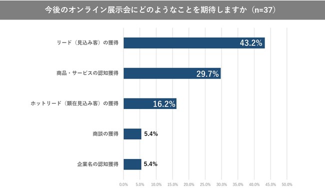 期待していることは、「リード(見込み客)の獲得」が最も多く、続いて「商品・サービス認知獲得」と今回の展示会に出展するにあたり期待していたことと同様の結果が出ました。オフライン展示会の代替として「商談の獲得」へ期待するのではなく、オンラインならではの強みを生かした「リード獲得」や「認知獲得」といった未来のビジネスの可能性を拡げることを期待していることから、DMMオンライン展示会が目指している「コミュニケーションプラットフォーム」としてオンライン展示会を活用することを、オンラインの利用が少ない産業の出展社側も期待していることがわかりました。