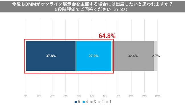 今後のDMMオンライン展示会への出展意欲を5段階で確認したところ、5,4と答える方が多い結果となり、平均の値も4と、今後も継続して出展意向が高い結果に。