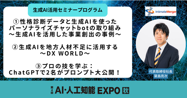 インティメート・マージャー、「第4回 AI・人工知能EXPO 秋」に出展決定!代表取締役社長・簗島亮次による生成AIセミナーも実施