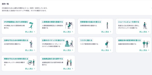 IPO準備には数多くの課題が伴いますが、本機能は、それらの課題を一つひとつ解決へと導く頼れるナビゲーターです。これからは、悩むことなく、迷うことなく、IPO準備に取り組むことが可能となります。