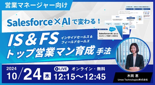 新人からトップセールスを輩出するコネクテッドセールス・プラットフォーム*「Front Agent」を開発・提供するUmee Technologies株式会社(本社:東京都調布市、代表取締役:新納 弘崇、以下「ユミー」)は、10月24日(木)12:15~12:45にオンラインセミナー「Salesforce×AIで変わるIS&FSトップ営業マン育成手法とは」を開催いたします。