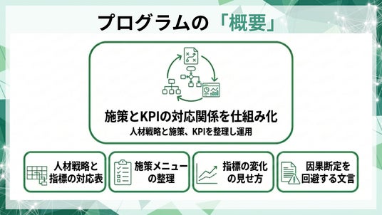 本プログラムは、人材戦略と施策、人的資本KPIの対応関係を整理し、運用として回すためのDX支援です。