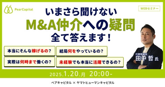 ヤマトヒューマンキャピタル株式会社(本社:東京都千代田区、代表取締役:堀江 大介)は2025年1月20日 (月) 20:00よりオンラインにて、株式会社ペアキャピタル代表取締役 田中 哲氏にご登壇いただき、ウェビナー『いまさら聞けないM&A仲介への疑問に全て答えます!』を開催いたします。