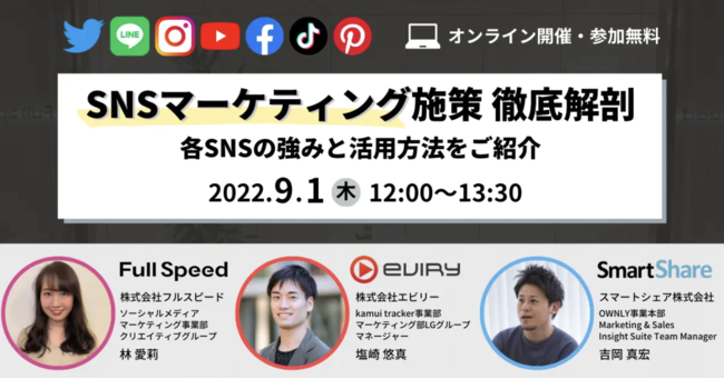 SNSマーケティングプラットフォーム「OWNLY」(オウンリー)を開発・運営するスマートシェア株式会社(東京都渋谷区、代表取締役 西山統、以下「当社」)は、株式会社フルスピード(東京都渋谷区、代表取締役社長 吉澤竹晴、以下フルスピード)、株式会社エビリー(東京都渋谷区、代表取締役社長 中川恵介、以下エビリー)と2022年9月1日(木)にオンラインセミナーを開催いたします。
