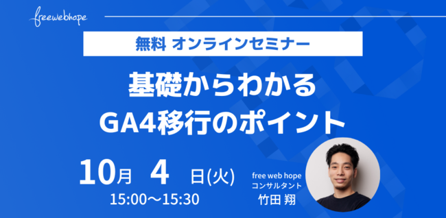 株式会社free web hope(本社:東京都千代田区、代表取締役:相原ゆうき)は、無料のオンラインセミナー「基礎からわかる Googleアナリティクス移行のポイント」を10月4日(火)に開催いたします。