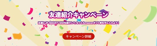 ■キャンペーン情報についてJP SMART SIMはこれからも期間限定のキャンペーンを実施していくので、最新の友達紹介キャンペーン情報は、公式サイトの友達紹介ページまたは公式Facebookでご確認いただけます。