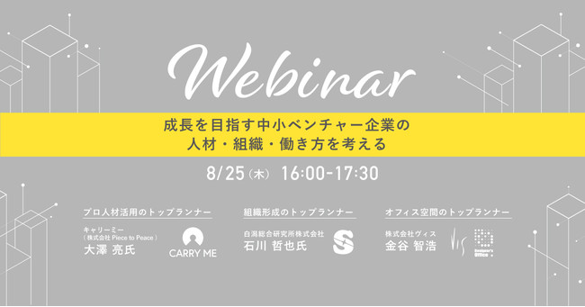 デザイナーズオフィスを手がけ、「はたらく」をデザインする株式会社ヴィス(本社:大阪市北区、代表取締役社長:金谷智浩)は、2022年8月25日(木)に、無料オンラインセミナー「成長を目指す中小ベンチャー企業の人材・組織・働き方を考える」を白潟総合研究所株式会社、株式会社Piece to Peaceと共催で開催することをお知らせします。
