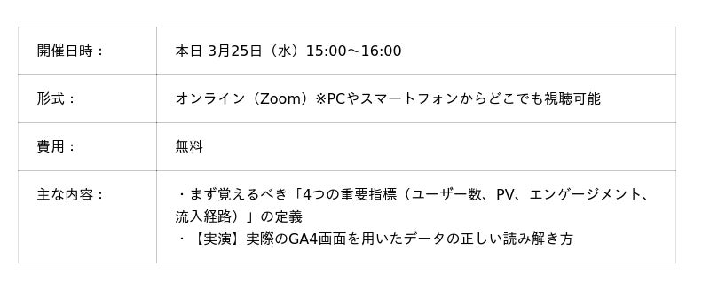 ハイブリッドテクノロジーズ日本とベトナムを拠点にグローバルIT総合サービスを展開する株式会社ハイブリッドテクノロジーズ(本社:東京都中央区、代表取締役社長:平川 和真、証券コード:4260、以下「当社」)のグループ会社であるドコドア株式会社(本社:新潟県新潟市、代表取締役社長:本間 孝之、以下「ドコドア社」)は、2026年3月25日15時より、サイト分析の第一歩を支援する「GA4超入門ウェビナー」を開催いたします。