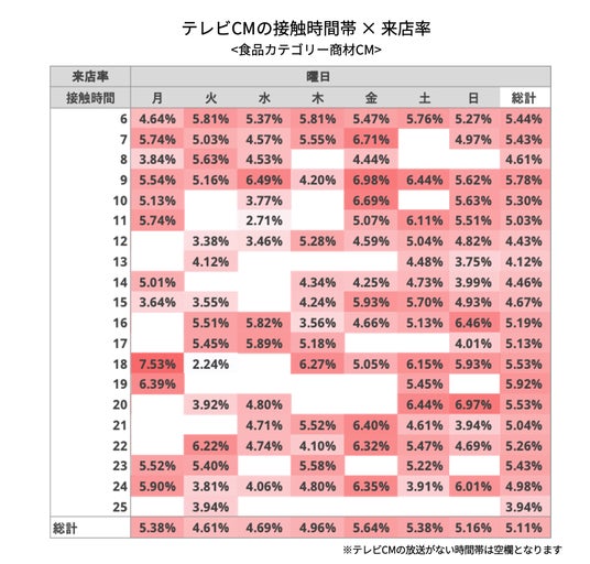 分析1.とあわせ、テレビCMに接触した曜日・時間帯別の来店率、および放送局別の来店率計測も行いました。これにより、テレビCM放映時間帯ごとの来店寄与度や、放送局別の来店寄与度が明らかになりました。