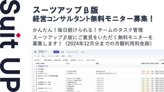 株式会社スーツ(所在地:東京都千代田区、代表取締役社長CEO:小松 裕介)は、チームでかんたん、毎日続けられるプロジェクト・タスク管理ツールの経営支援クラウド「Suit UP」(スーツアップ)の経営コンサルタントの無料モニターを募集いたします。