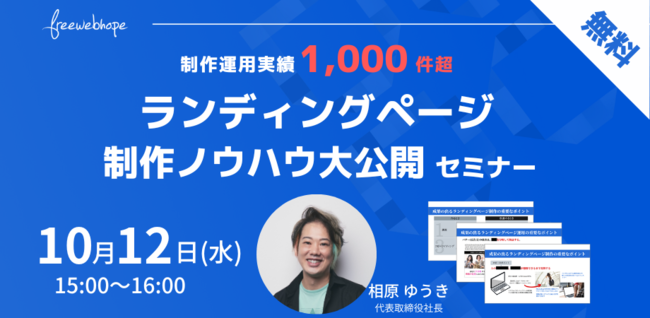 株式会社free web hope(本社:東京都千代田区、代表取締役:相原ゆうき)は、無料のオンラインセミナー「制作運用実績1,000件超 ランディングページ制作ノウハウ大公開セミナー」を10月12日(水)に開催いたします。