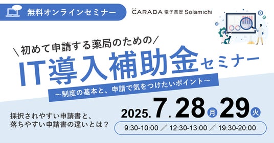 クラウド電子薬歴『CARADA 電子薬歴 Solamichi』の企画・開発・販売を行う株式会社ソラミチシステムは、無料オンラインセミナー「初めて申請する薬局のためのIT導入補助金セミナー ~制度の基本と、申請で気をつけたいポイント~」を7月28日(月)、29日(火) に開催します。