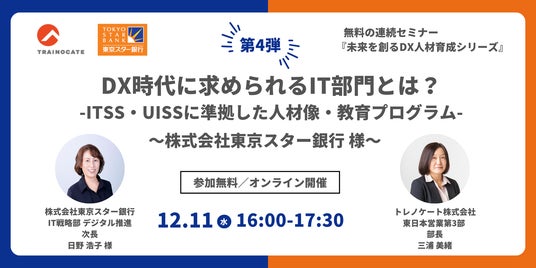 シリーズ第4弾のゲストである株式会社東京スター銀行様からは、IT戦略部 デジタル推進 次長の日野様を迎え、「ITSS・UISS」を活用しながら独自に進められているIT部門の人材像・スキル定義、育成方針を語っていただきます。