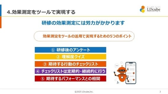 本セミナーでは、 研修の効果測定のやり方、効率的に実施するためのツールについて紹介します。